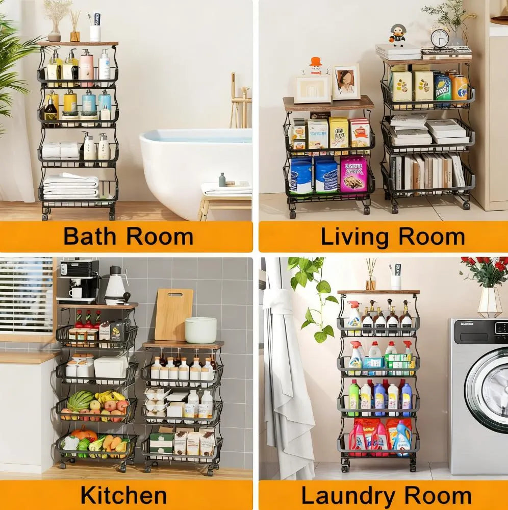 Wooden-Top Storage Basket: Featuring 5 versatile tiers for fruit and vegetable storage, the sturdy wooden top serves as both a functional surface for kitchen essentials and a protective barrier against dust. Removable baskets adapt flexibly to your spatial requirements.